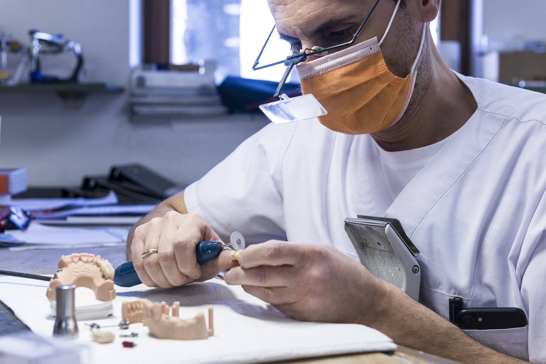 Auch wenn Du viel handwerkliche Fingerfertigkeit benötigst, findet ein großer Teil unserer Arbeit bei Isar Dental inzwischen am Bildschirm statt: Kronen und Brücken zum Beispiel werden am Computer designt und anschließend automatisiert gefertigt. Der Zahntechniker steuert und überwacht den komplexen Prozess.